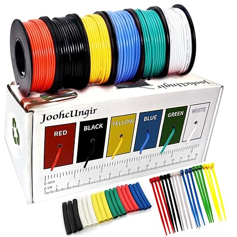 - Comprehensive Wiring Solution — This wiring kit includes 6 colors (red, yellow, blue, green, black, white) of wire, each spool measuring 25 feet/7.6 meters in length(total 150ft). Additionally, it comes with 18 heat shrink tubes and 18 zip ties, providing a one-stop solution for all your wiring and insulation needs. This professional-grade hook up wire set is designed to fulfill every requirement