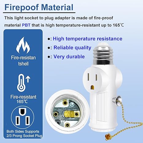 - 【 Safe & Durable】This light socket outlet can withstand high temperature up to 329℉ (165℃) retardant PBT material and high conductive brass,the safety performance has been enhanced,more heat resistant, corrosion resistant and durable, the light socket to plug adapter is FCC listed to ensure your products are supported by the highest standards of safety and performance.