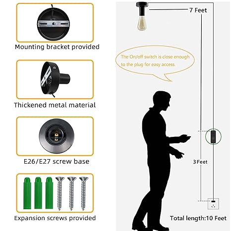 • Light Socket Extension Cord is 10 FEET—–The basic light socket with cord consists of metal standard screw base and 18AWG pure copper lamp cords with US plug and 303 type button inline switch and screwed mounting bracket, the wire total length is 10 feet(3.06m), cable distance from polarized plug to rocker switch is 3FT (0.92m), from switch to light bulbs socket is 7FT (2.14m).