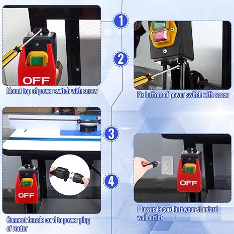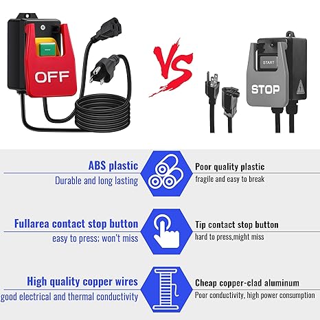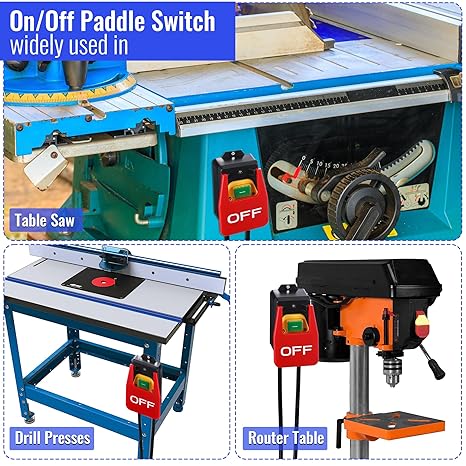 - Easy to Locate: large red OFF paddle for emergency stop, fully contact with the OFF button, so you will not miss a shutdown; The router switch is engaged with a large green recessed ON button safeguarding against accidental starts; This table saw switch is in a safer, easier way to work