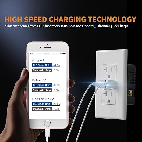 • ✅【High-Speed Charging Tech】 In-wall duplex receptacles with two USB charging outlets with a total output of 4.0 Amp (2.0A standalone), 5V DC
