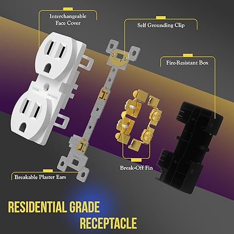• 10 Pack; 15A 125V, 5-15R, self-grounding, 2-pole, 3-Wire. UL94, V2 Rating, 1-year warranty , UL Listed