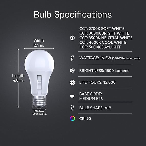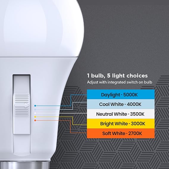 - ✓ADJUSTABLE COLOR TEMPERATURE: A21 100-watt equivalent LED light bulb offer a customizable Correlated Color Temperature, allowing you to switch between 2700K soft white and 5000K daylight lighting to suit your preference or the specific atmosphere you desire.