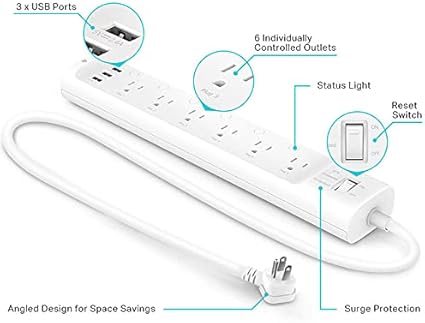 - 6 smart outlets: Independently control 6 smart outlets, and charge 3 devices with built in USB ports; Ideal for controlling electronics in your home, home office, or small business