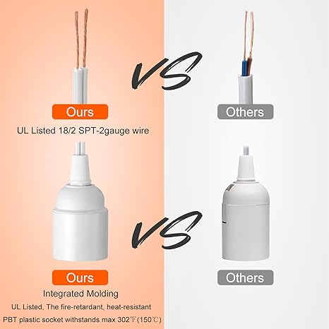 - 【Use with Confidence】 All parts of this product are strictly UL approval. The fire-retardant, heat-resistant PBT plastic socket withstands max 302℉(150℃) and frees your use of fire-hazard. Safe, odor-free, environmentally friendly,free of lead and phthalates. Our lamp cord is more quality and has a longer service life. 3-month refund and 1-year warranty. Any issue or inquiry of the product, please feel free to contact us.