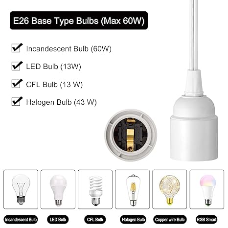 - 【Specification】 UL Listed 18/2 SPT-2gauge wire. The max power is 100W, working voltage 0-250V. The light socket is standard e26 base, suits for Incandescent Bulb (60W)/LED Bulb (13W)/CFL Bulb (13 W)/Halogen Bulb (43 W).The wire length between button and the plug is approx 35inch(90cm),convenient switch operation.