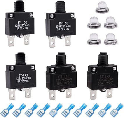- Package Includes: 5 PCS thermal circuit breakers(3A,5A,10A,15A,20A)+5 PCS Waterproof Button Caps +10 PCS Quick Connect Terminals