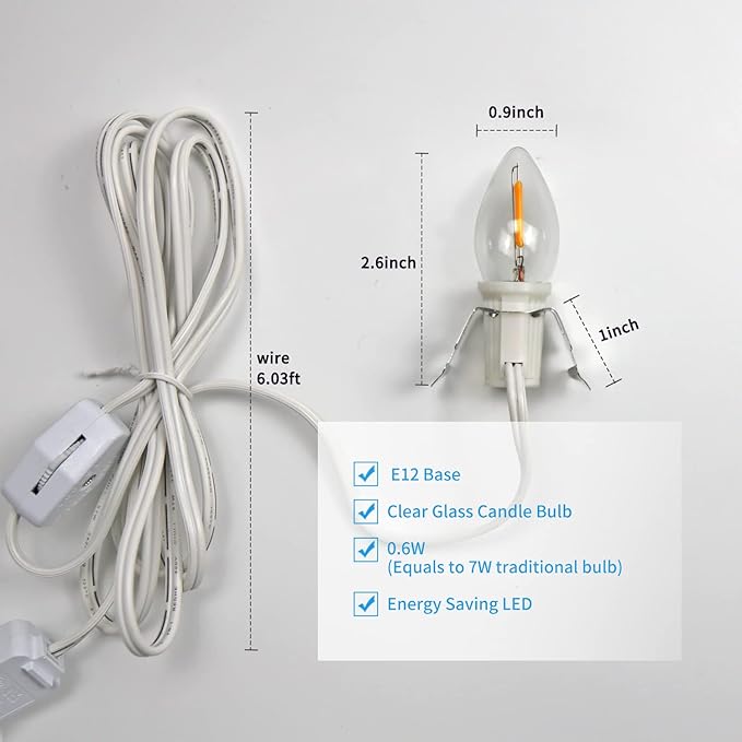 - [Blow Mold Light Cord with Clip Bulb] C7/E12 Candelabra LEDBulbs, 120V / 0.6W (7 Watt equivalent incandescent) bulbs, 25,000hours lifespan, 50Lumes, 2700k soft Warm White, Non-Dimmable,simply attach the clip to fix each bulb into village house, craft, lampand more.
