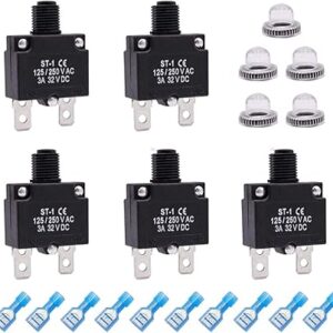mxuteuk 5Pcs 3Amp Circuit Breakers Push Button Manual Reset 125/250V AC 32V DC,Overload Protector Switch Thermal Circuit Breakers with Quick Connect Terminals and Waterproof Button Caps ST1-5-3A